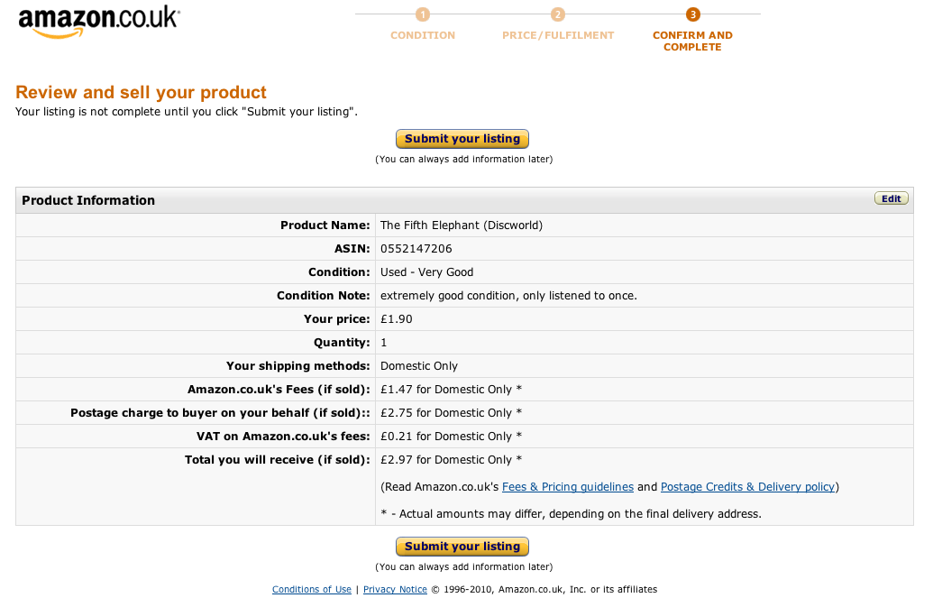 One of the items I was intending to sell wasn’t worth much, and my planned sell price was only £1.90. So when I came to the following screen and saw the fees Amazon would charge me for placing this listing would be £1.47 I decided it wasn’t worth the effort and to cancel the listing.