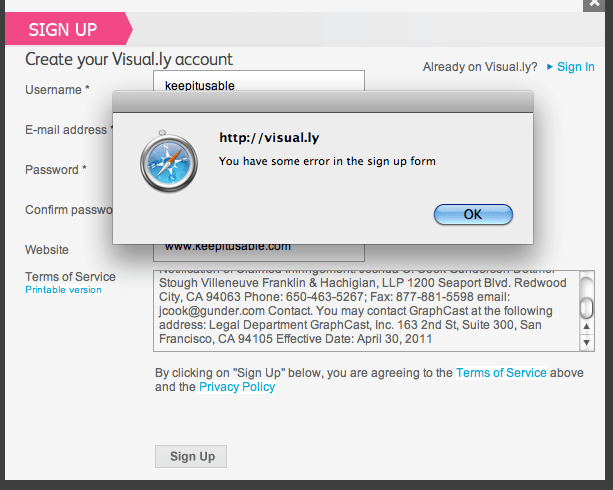 Seriously do some designers and developers think users are mind readers? I’ve just tried to signup for visual.ly and believe i’ve filled out the form correctly, yet I continue to get this annoying and ridiculous ‘helpful’ dialogue: